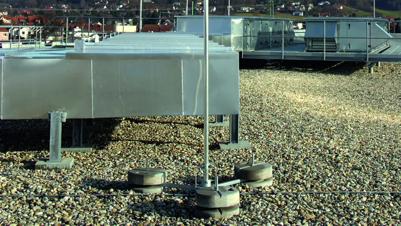 Roof conductor holders, expansion pieces and bridging components (cables, strips, lugs) for flat roofs.
